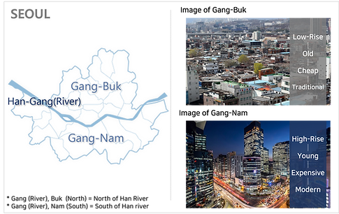 The Han River divides Seoul into south, Gang-Nam, and north, Gang-Buk.